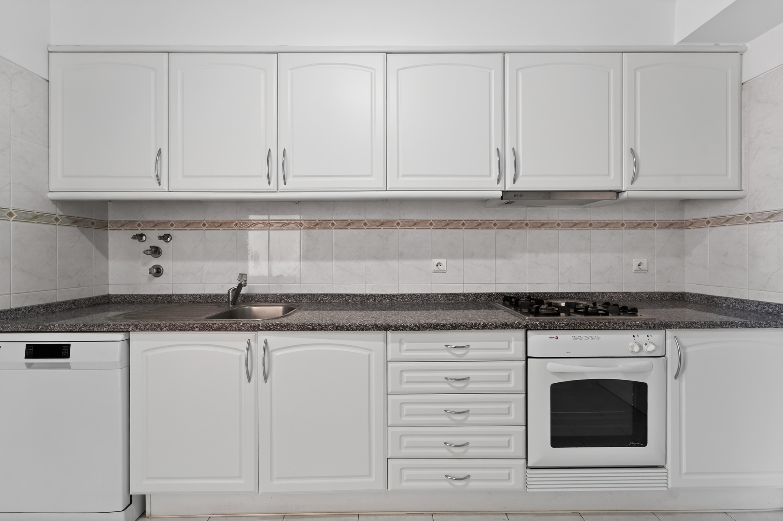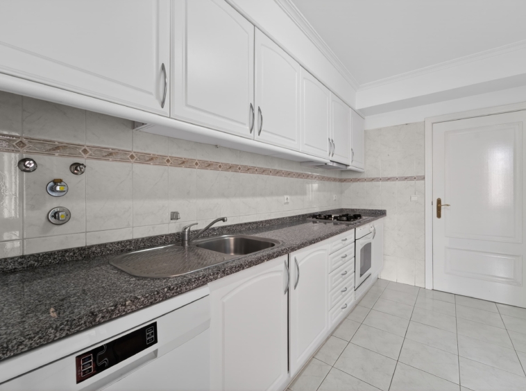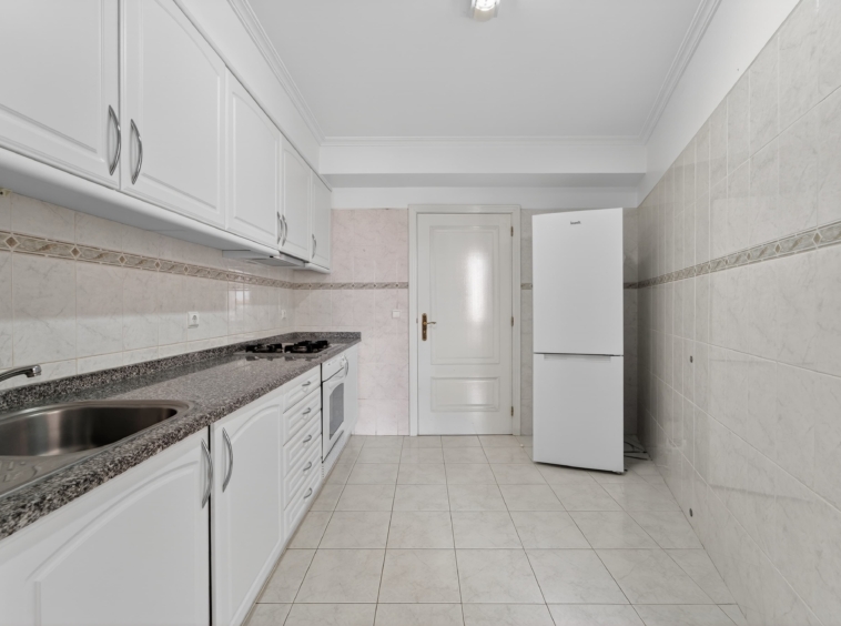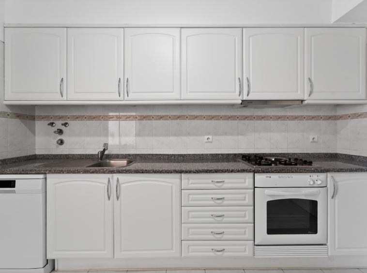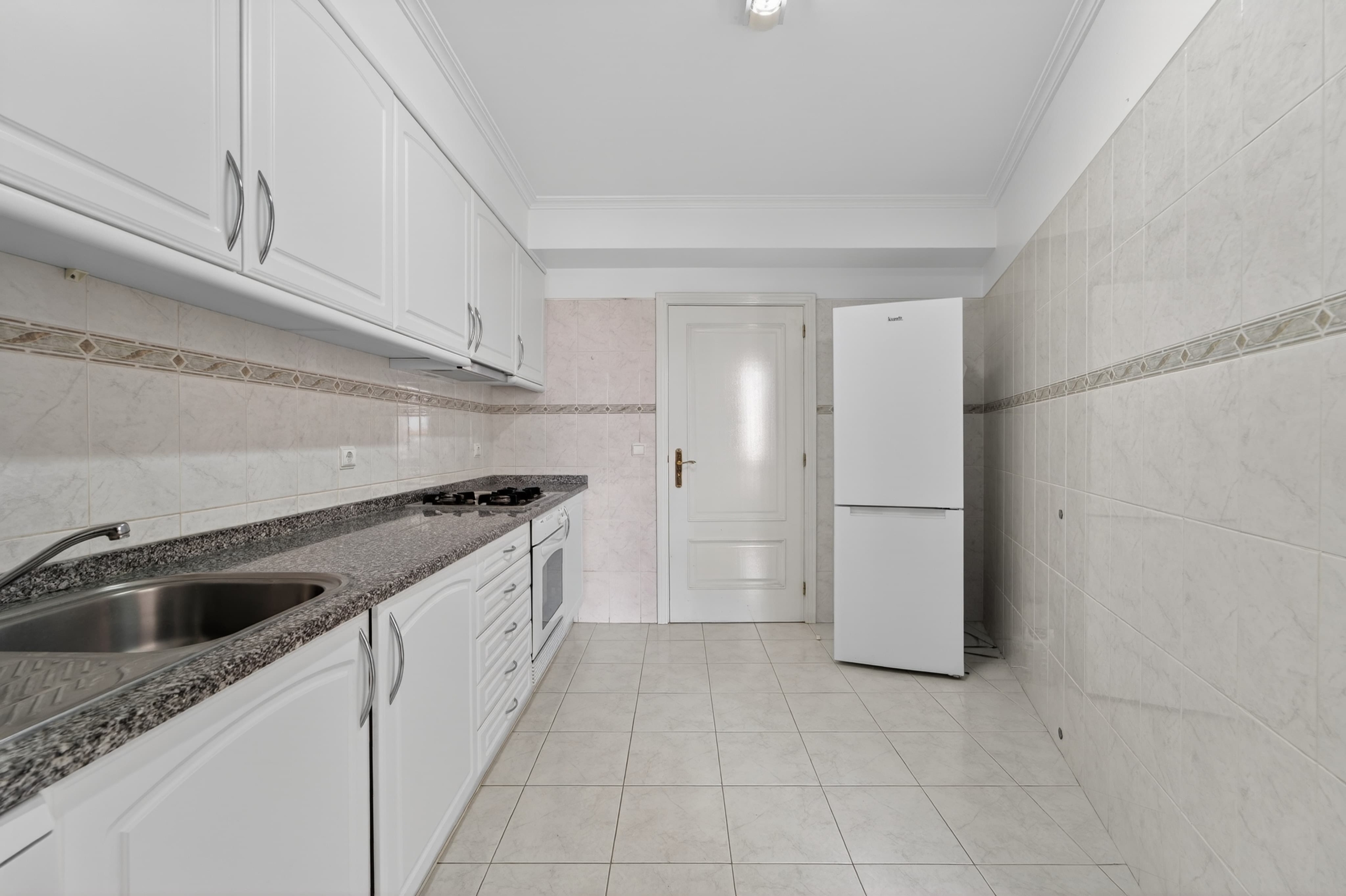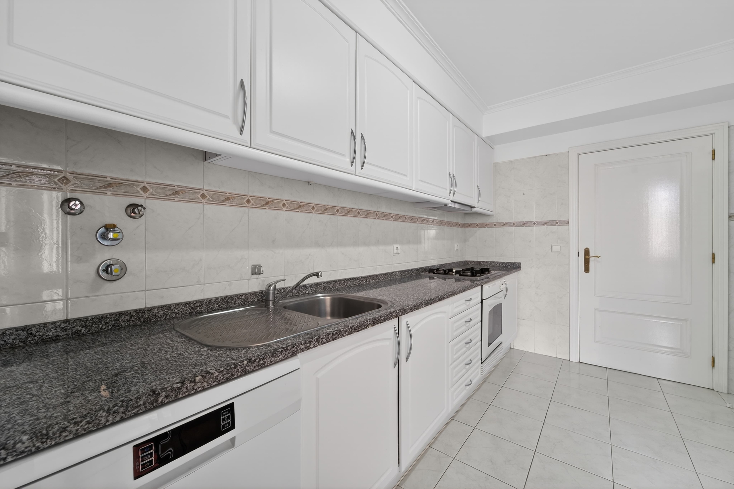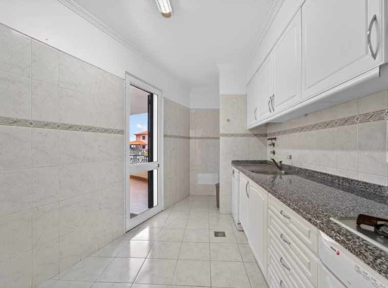 The kitchen is arranged in a practical and efficient way, with a dedicated area for laundry and storage, allowing for optimized use of space.